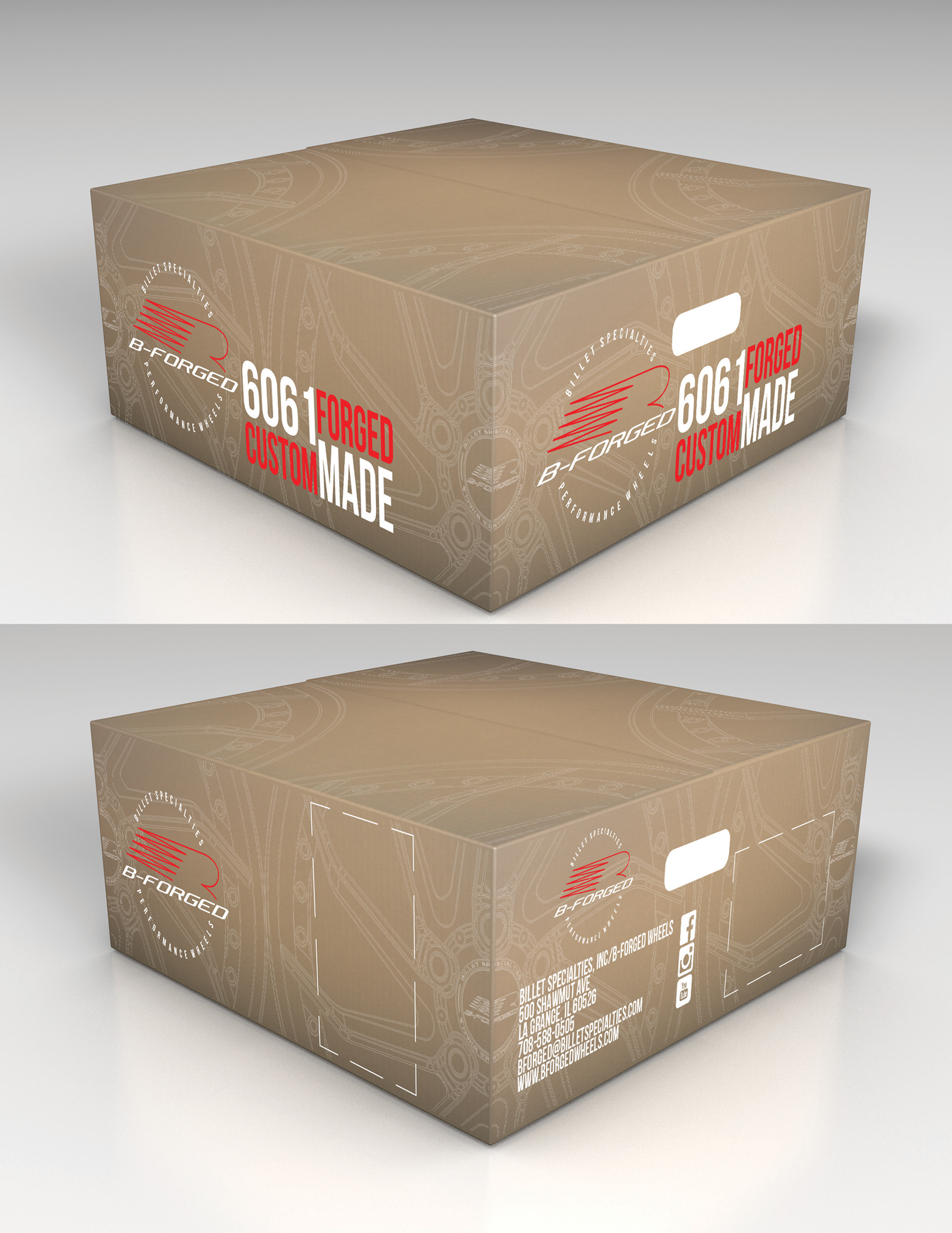 Developed custom wheel packaging for the B-Forged line, aligning with the raw cardboard + white ink trend to achieve a premium yet industrial aesthetic. Integrated engineering line work and brand graphics into a clean press-ready design that reinforced consistency while meeting dyeline and print requirements.