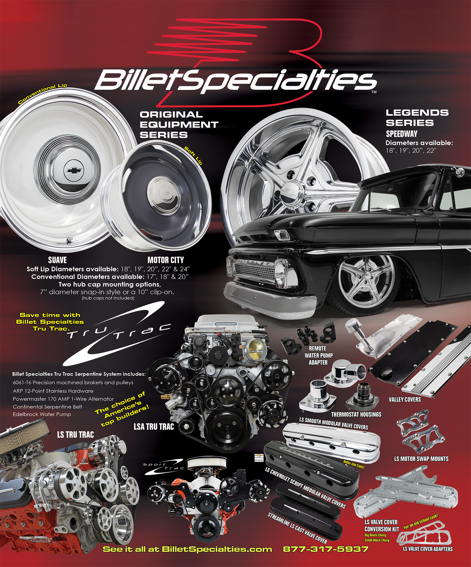Designed a full-page magazine ad highlighting Billet Specialties wheels and engine accessories. Built a bold, brand-forward composition anchored by product photography with clear hierarchy for technical