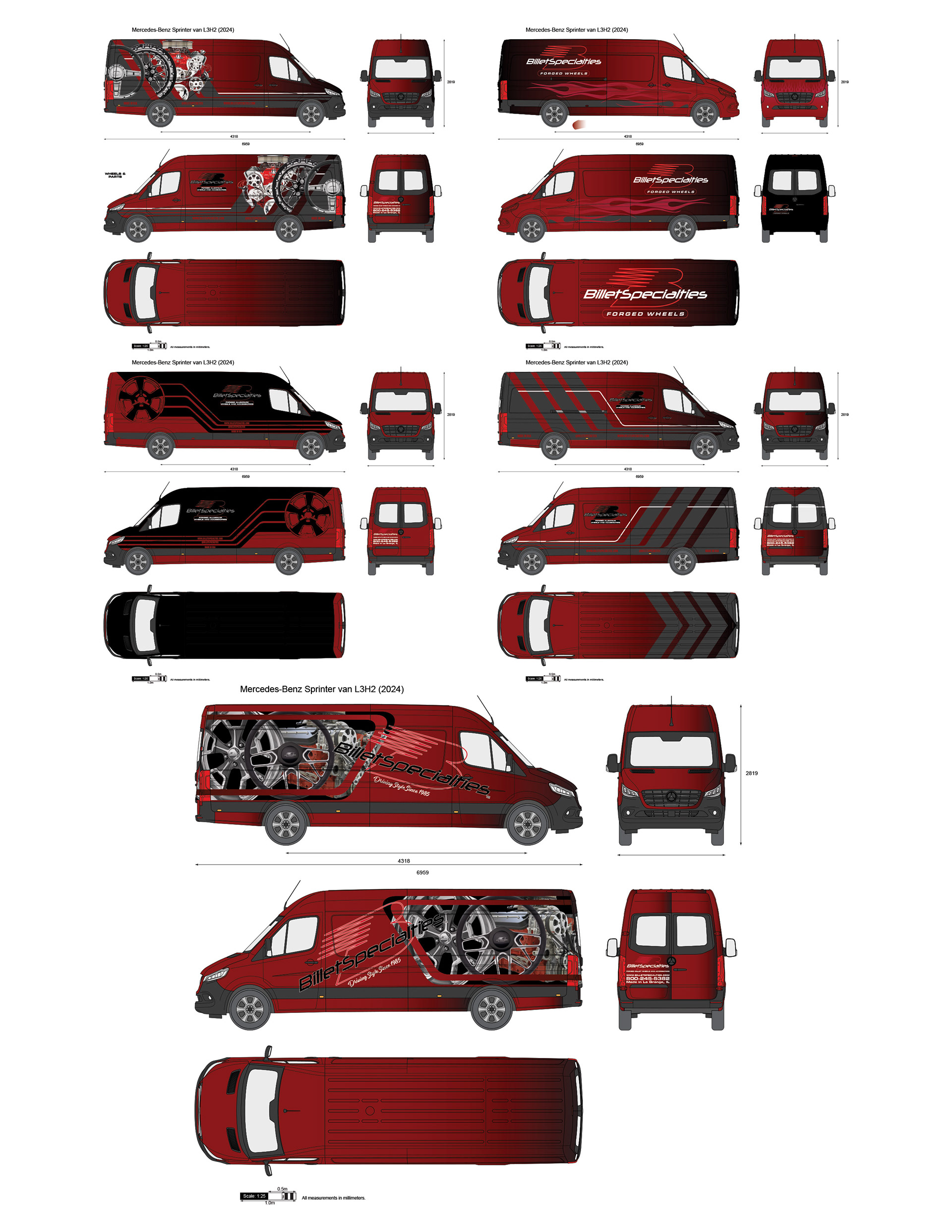 Developed vehicle-wrap concepts to modernize Billet Specialties’ trade-show presence, proposing a shift from the truck-and-trailer setup to a more agile Sprinter van. Designed multiple wraps that showcase wheels and components for maximum event visibility; the pitch led to the purchase of a Sprinter van now used as part of the company’s marketing fleet.